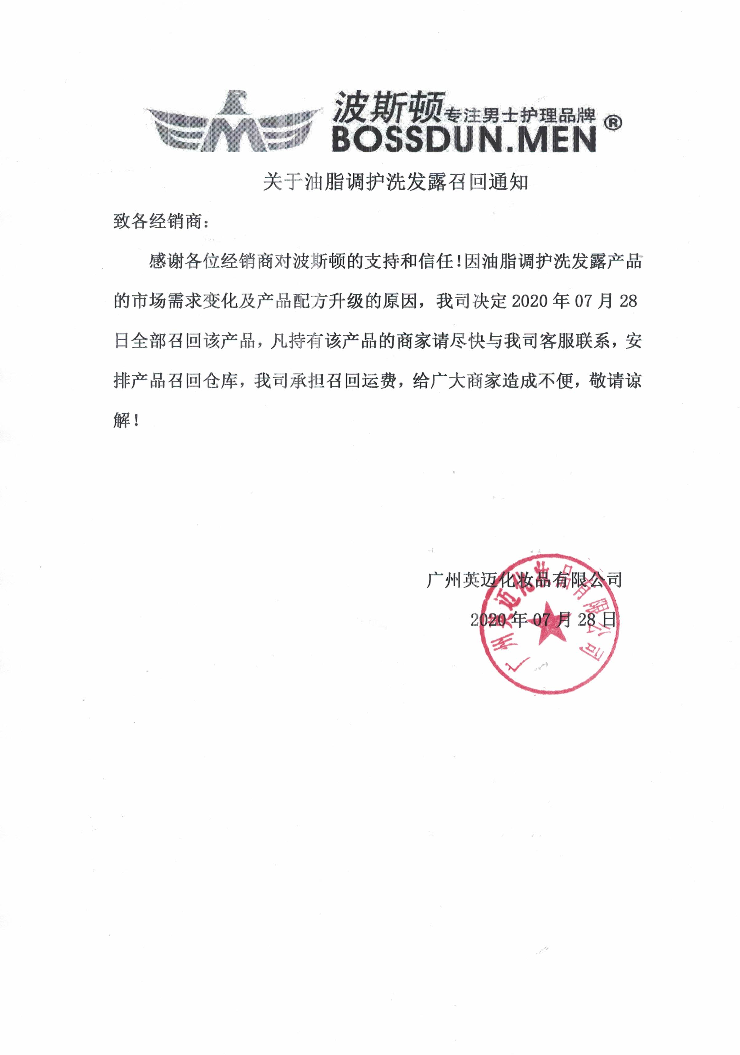 感謝各位經(jīng)銷(xiāo)商對(duì)波斯頓的支持和信任!因油脂調(diào)護(hù)洗發(fā)露產(chǎn)品的市場(chǎng)需求變化及產(chǎn)品配方升級(jí)的原因,我司決定2020年07月28日全部召回該產(chǎn)品,凡持有該產(chǎn)品的商家請(qǐng)盡快與我司客服聯(lián)系,安排產(chǎn)品召回倉(cāng)庫(kù),我司承擔(dān)召回運(yùn)費(fèi),給廣大商家造成不便,敬請(qǐng)諒解!